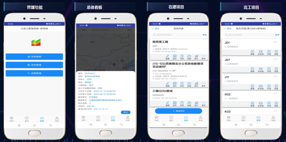 在手機端,本系統(tǒng)提供總體看板、項目管理和成果管理功能。企業(yè)管理者可直接在移動端對企業(yè)所有的工程進行整體查看,可進行在建工程的進度瀏覽、任務(wù)分配,對完工項目可直接查看相關(guān)數(shù)據(jù)資料、圖件文檔等信息。在網(wǎng)頁端,系統(tǒng)同樣提供豐富的數(shù)據(jù)查看窗口以及單工程、多工程的數(shù)據(jù)統(tǒng)計功能。滿足企業(yè)管理者對企業(yè)項目的全局把控。同時CIM綜合展示系統(tǒng)可滿足企業(yè)管理者在網(wǎng)頁端對勘察專業(yè)、設(shè)計專業(yè)、測繪專業(yè)等多個專業(yè)的數(shù)據(jù)成果三維可視化瀏覽。